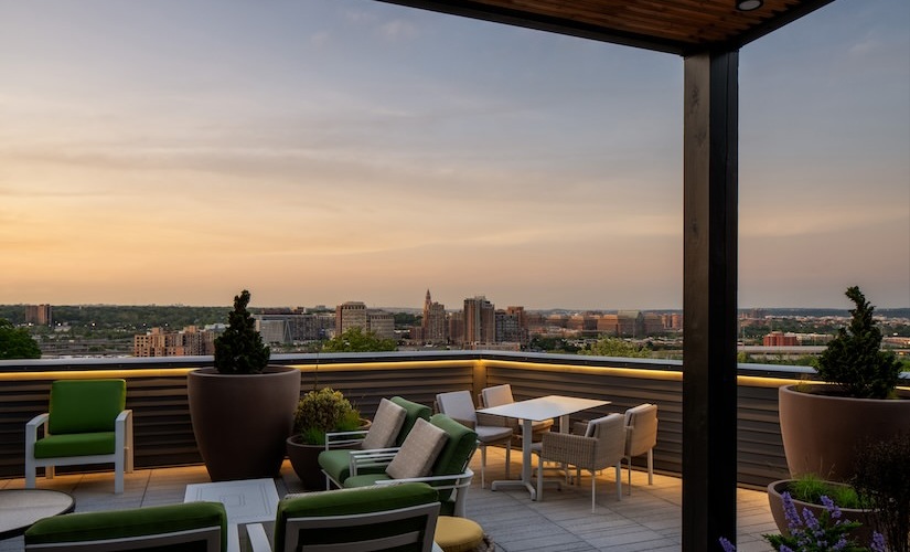 Explore Aspire Huntington Station’s 7th floor indoor/outdoor terrace with skyline views of Alexandria